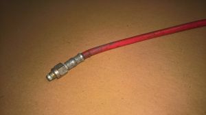 Nylon inner line with inox steel braid reinforcement, covered by a red rubber outer sheath.