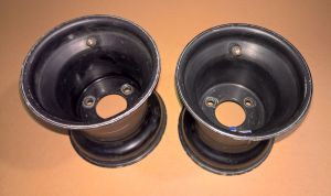 Set of (2) DWT Douglas Wheel Alumalite wheels, part # 725-109 . Show wear on the lips from use (see photo), but in good working condition. Includes installed valve stems. Original color is BLACK.