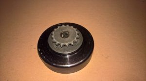 Genuine IAME early-type (3-hole-sprocket) Leopard clutch drum part # A-60550, with included 16T #219 sprocket. Drum has internal countersunk sprocket mounting bolt holes and bolts mounting from the inside, as required for use with the 16T sprocket (see photo).
