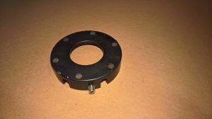 Designed to mount on the wheel hub with 3 set screws for centering & securing (see photo). Flange I.D. = 56.5mm nominal, center hole I.D. = 36mm nominal.