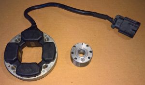 Selettra IAME Leopard ignition stator assembly, part # X30125952A. Used in good working condition. "Purple pigtail" type plug connector (see photo).